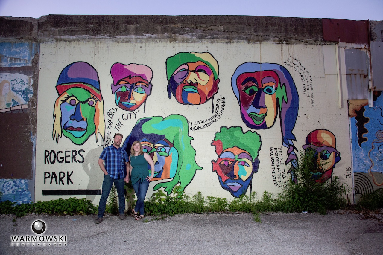 It’s so great to be able to photograph our couples in locations that are special for them. Meghan & Aaron live on the Lake Michigan lakefront, and we took them around Loyola Park and Loyola Beach, looking for great photo spots. Aaron takes the Red Line all the time, and knew where all the good murals were located.
