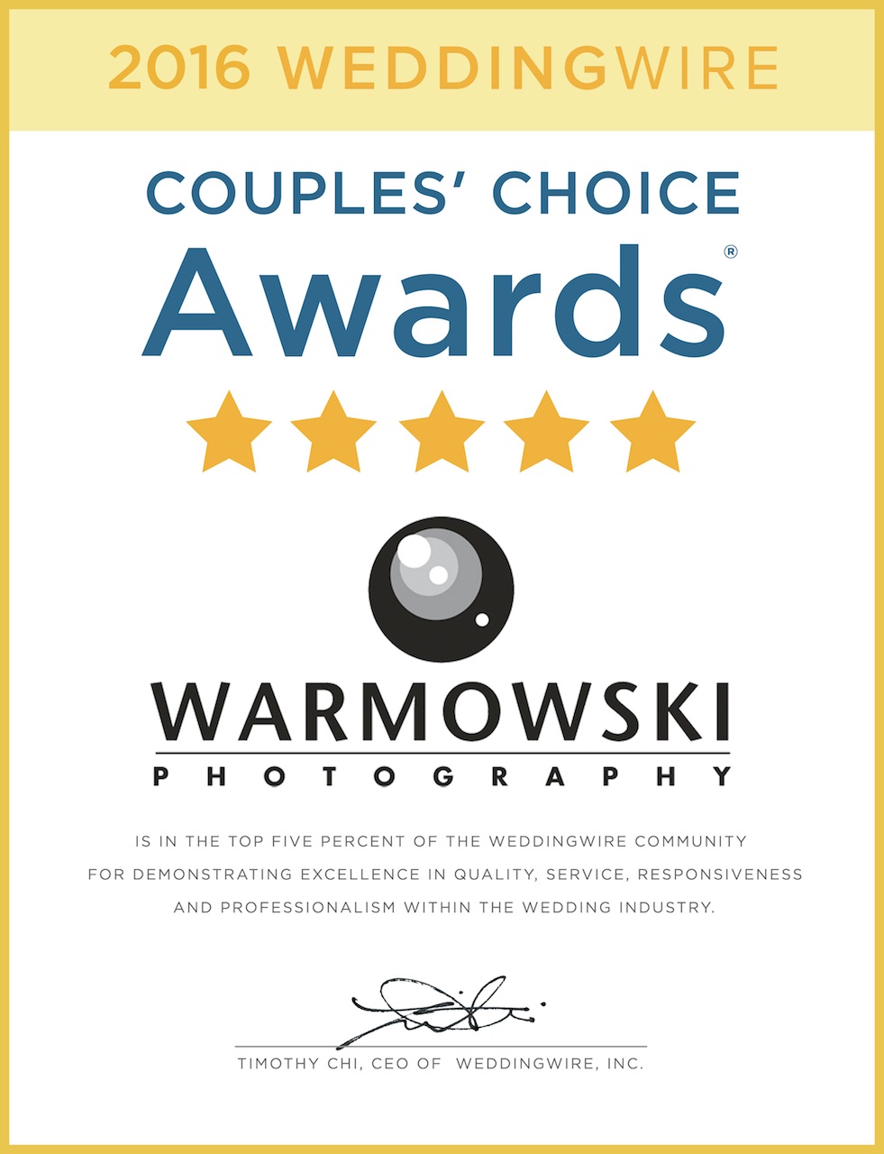 Warmowski Photography is proud to be one of the top photographers in the WeddingWire Network. We would like to thank our past clients for taking the time to review our business on WeddingWire. We value all of our clients and truly appreciate the positive feedback that helped us earn the WeddingWire Couples’ Choice Awards 2016.
