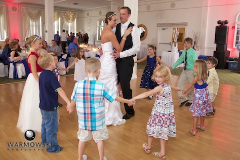 Best thing about this wedding — Amber had an amazing first dance with her father. They started out dancing, but then a volleyball was thrown in. Bill tossed the ball to Amber, and the bride bumped it back. Amber said sports was more their style than dancing. They did this “a million times” when she was growing up, so it was a great way to bring out their true personalities on her wedding day.